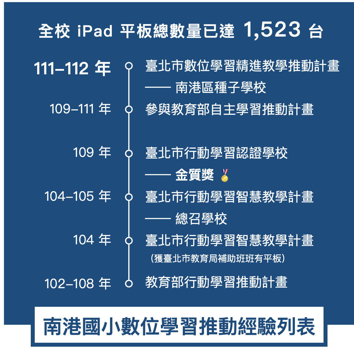 以「智慧南港 無際飛航」為主軸,培養孩子未來資訊素養能力以及競爭力,讓科技為孩子創造不一樣的學習新體驗。南港國小致力於透過「數位學習 X 多元展能」,成就一艘艘太空船,航向無垠未來。